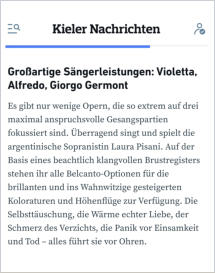 DeFeis International Artists: Link!Aktuelle Agentur-News: Link!Aktuell: Laura Pisani brillierte in Kiel und auch in Oldenburg als Violetta in La Traviata und bekam fantastische Kritiken! Ende November singt sie Traviata in Buenos Aires im Teatro Colon, in Oldenburg dann noch einmal am 5. und 31.Dez! „Laura was amazing. She not only sang beautifully but was traviata with all her different facets of emotion. Her sincerity and portrayal of Traviatas vulnerability made me cry several times. The audience was captivated and wanted to applaud even in between when she had pauses in her arias or in her ensembles. I have heard alot of traviatas who are currently on the top and Laura I must say in all honesty is up there.“ (Doreen DeFeis)Link kompletter Artikel Ioco.de (Kultur im Netz) vom Staatstheater OldenburgLink kompletter Artikel Kieler NachrichtenLink Kurz-Artikel SHZ: „Gelungene Premiere: Guiseppe Verdis „La Traviata“ begeister mit Dramatik und starker Besetzung.“Link SAT.1 Bericht auf YouTubeWeitere aktuelle News:Viele neue Sänger/Sängerinnen wurden in unserer Kartei aufgenommen.Laura Pisani (meine dramatische Koloratur Sopran) feierte am 8.Feb‘24 großen Erfolg als Ceci in der Oper „Il Guarany“ von Carlos Gomez im Theater in Sao Paulo Brasilien. Ende November wird sie in Argentinien im Theatro Colon die Traviata singen. Zuvor sang sie im Sommer auf den Festspielen in Kiel und 5 Vorstellungen im Staatstheater Oldenburg! Auch Nenad Cica als Peter Grimes und Dusica Bijelic als Ellen Orford hatten eine sehr erfolgreiche Premier von Peter Grimes „Britten“ in Bielefeld am Samstag 11.Okt. Großer Jubel und Standing Ovations! Link Concerti Opern-Kritik Theater Bielefeld Peter Grimes Weitere Gast- und/oder Festvertäge für Freja Sandkamm (lyrischer Sopran) und Emily Hughes (Mezzo) sowie meine neue Mezzo Klara Brockhaus und Sopran Gabriele Jocaite, so auch für Abongile Fumba (Alt) sowie die Tenöre Leilei Xie und Jongwoo Kim (Tenor) und den Bariton Frank Dolphin Wong.Mein Spinto-Heldentenor Gustavo Lopez Manzitti wird als Gast im Teatro Mayor in Bogota Columbia von Jan‘26 - Feb‘26 die Rolle des Erik im Fliegender Holländer singen und danach die Rolle des Jim Mahoney in Mahagony von Kurt Weill im Palacio de bellas Artes in Mexico City, Mexico. Durch meine Vermittlung war er im Dezember 2024 als Gast für die Rolle „Bacchus“ in Ariadne auf Naxos (R. Strauss) im Teatro La Maestranza in Seville. Er hat grossen Erfolg gehabt. Seit der Spielzeit 23/24 gehört er fest zum Ensemble des Landestheater Coburg uns singt dort aktuell Herod in Salome. Sarah Richmond (Mezzo Sopran) hat durch meine direkte Vermittlung einen Cover-Vertrag in London in der Covent Garden Royal Opera als „Hänsel“ in Hänsel und Gretel - englische Fassung - bis zum 9.Jan bekommen!Nov.‘ 2025